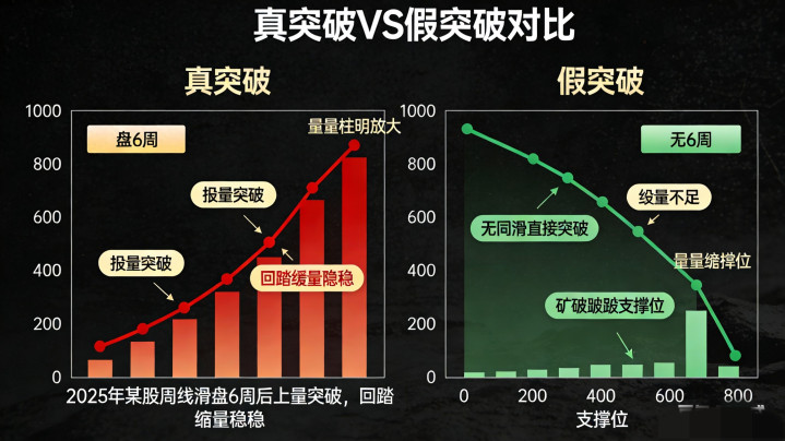 - 2025年案例:科大讯飞在2025年6月到8月,在145元附近横盘6周,震荡幅度仅12%,期间成交量温和放大,明显是主力在吸筹;9月第2周突破后,股价一路上涨,涨幅达40%。而另一只科技股,2025年10月没有横盘震荡,直接跳空突破前高,结果3天后就回调,套住了一大批追高的散户。